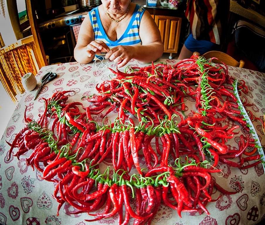 I peperoni da cui viene ricavato possono essere di varietà Paesanello e Corno di capra, sono stati raccolti ben maturi a luglio, impilati in crolli e fatti essiccare.