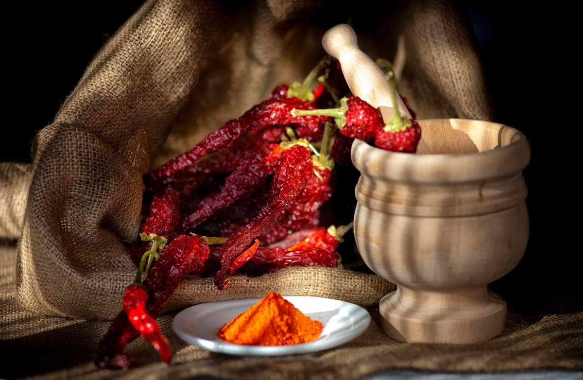 L’ultima fase è quella più delicata, vengono tostati nel forno a legna a bassa temperatura e tritati finemente servendosi di un mortaio; tali processi garantiscono il suo colore rosso intenso.