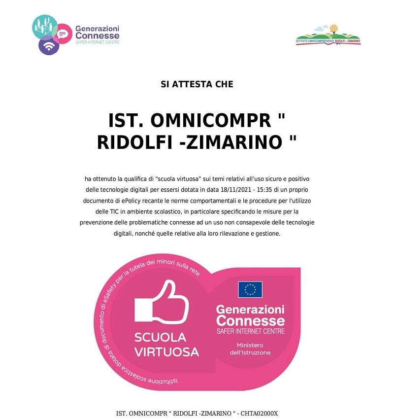 Sono generazioni connesse quelle odierne ma hanno necessità di esserlo nella maniera migliore e più virtuosa possibile. E tante sono le iniziative attive in tali direzione, coinvolgendo le agenzie educative come le scuole e stimolando così riflessioni a tutti. Esiste anche l’attestazione, da alcuni anni, di “Scuola virtuosa” per l’uso sicuro e positivo delle tecnologie digitali e nella lotta al bullismo e al cyber bullismo. Le Scuole Secondarie di Primo Grado “Ridolfi – Zimarino” hanno reso noto all’inizio di quest’anno di aver ottenuto la certificazione di “Scuola Virtuosa nella lotta al bullismo e al cyber bullismo” grazie all’impegno della professoressa Silvia Di Girolamo (insegnante presso la scuola di Casalbordino) e ai “componenti del gruppo di lavoro” che ha “elaborato il Documento di E-Policy per tutti gli ordini di scuola”. Un risultato importante per la comunità scolastica del nostro territorio che ci dona l’occasione di approfondire questo importante settore, le sue peculiarità e rischi e il progetto nazionale da cui tutta l’iniziativa è scaturita.