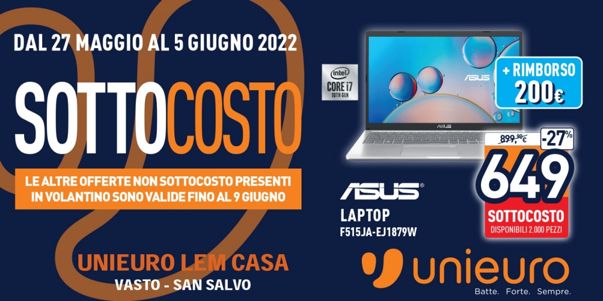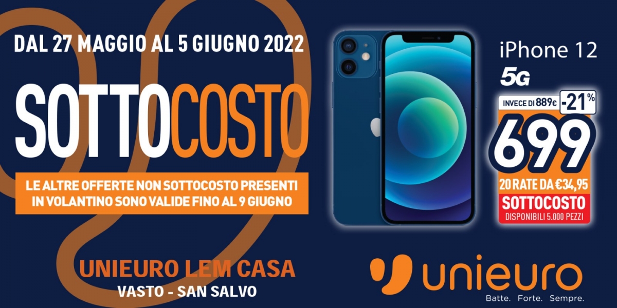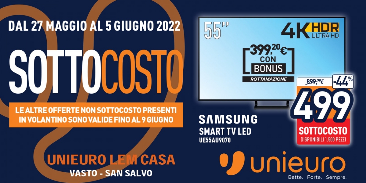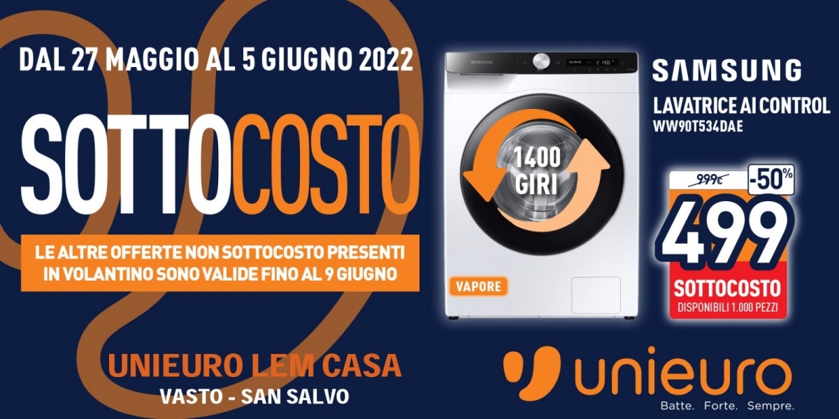 Nei punti vendita Lem Casa Unieuro di Vasto (circonvallazione Histoniense) e San Salvo (via gargheta n. 4) sono arrivate le offerte del SOTTOCOSTO valide da venerdì 27 Maggio fino a domenica 5 Giugno.