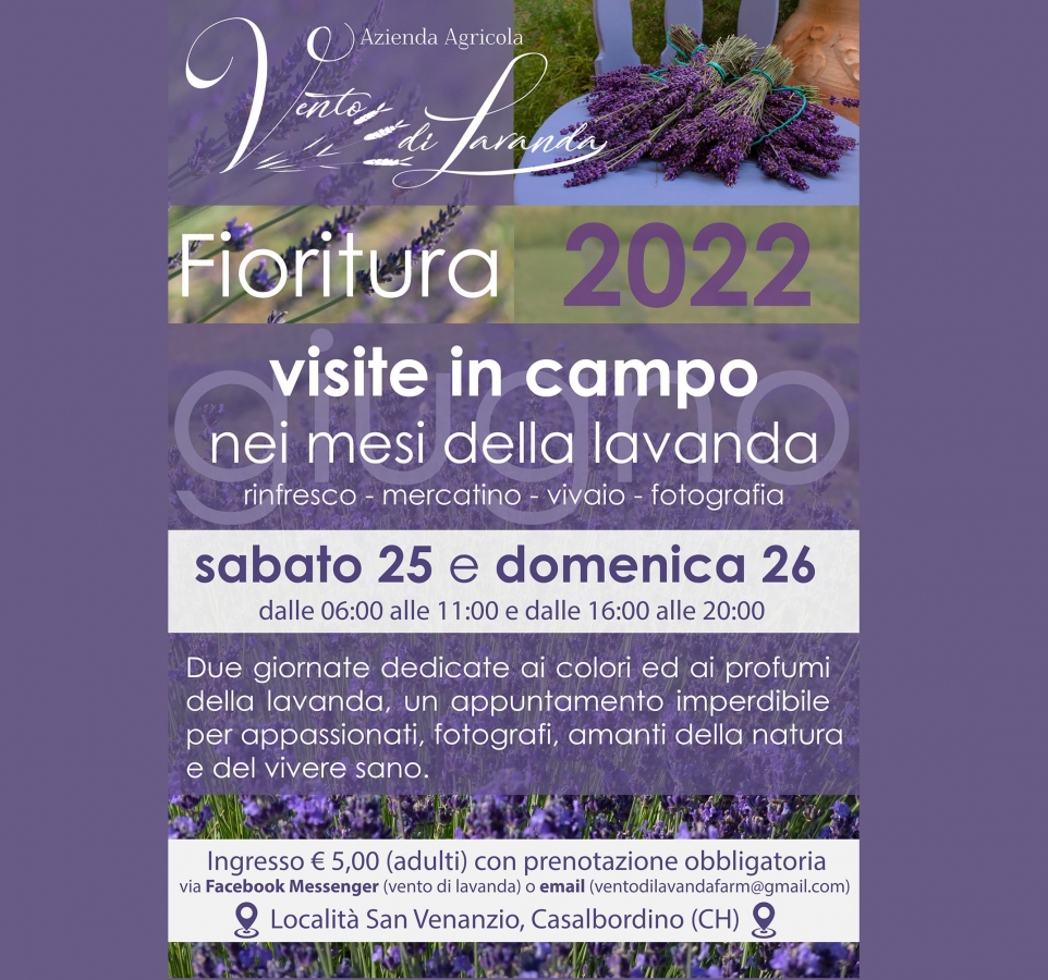 Per tutti coloro che amano la lavanda, i suoi colori e i suoi profumi, per tutti gli appassionati ma anche i fotografi, gli amanti della natura e del vivere sano, Sabato 24 e domenica 25 giugno, dalle ore 6 alle 11 e dalle 16 alle 20 l’Azienda Agricola “Vento di Lavanda” propone Visite in Campo nei mesi della lavanda, con rinfresco, mercatino, vivaio e fotografia in località San Venanzio a Casalbordino.
