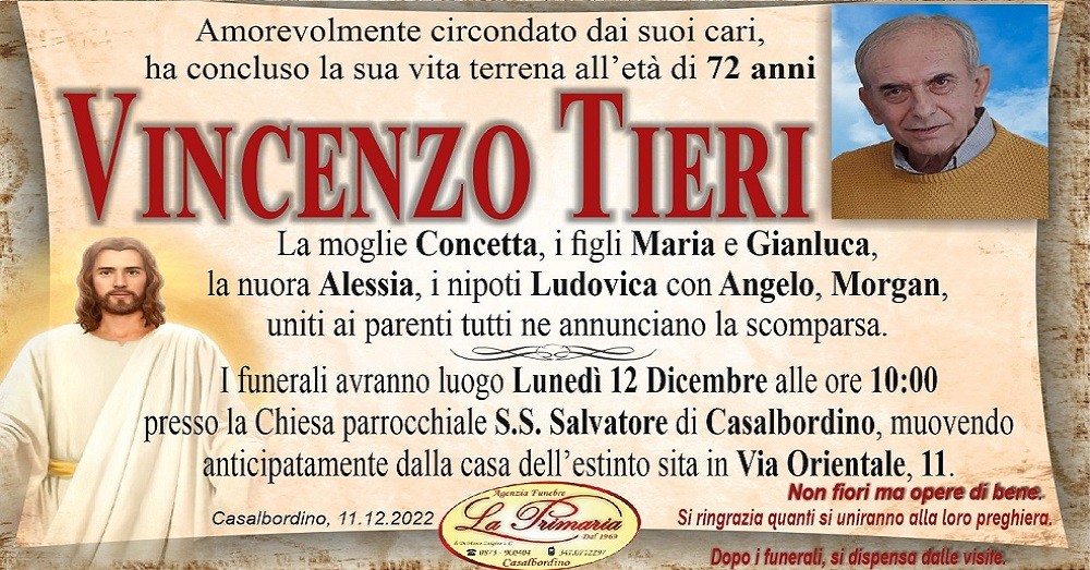 È venuto a mancare all’affetto dei suoi cari Vincenzo Tieri di anni 72.