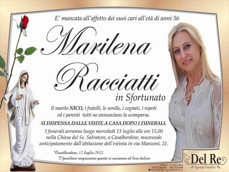 E' venuta a mancare all'affetto dei suoi cari Marilena Racciatti (in Sfortunato).