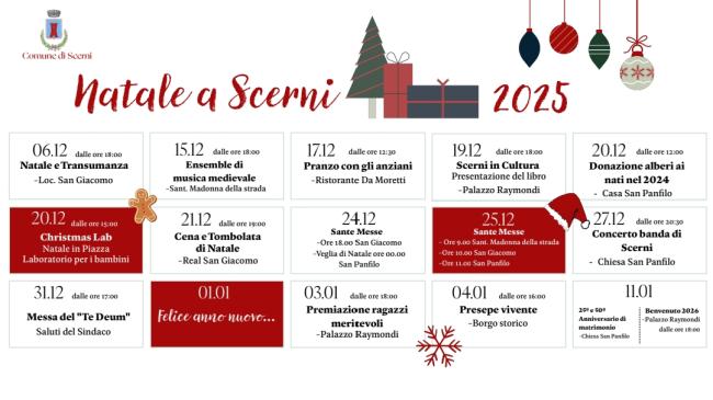 Un ringraziamento speciale va alle associazioni di Scerni che hanno collaborato con grande entusiasmo all'organizzazione degli eventi, agli addobbi e alle luminarie, contribuendo a rendere il nostro borgo ancora più accogliente e suggestivo. Il loro impegno, unito alla partecipazione di tanti cittadini, ha permesso di trasformare le nostre vie e Piazze in uno scenario natalizio che unisce tradizione, creatività e spirito comunitario".
