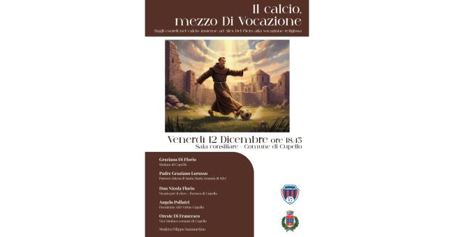 Venerdì 12 dicembre, alle ore 18,45, nella Sala consiliare del Comune di Cupello, si terrà l’incontro dal titolo “Il calcio, mezzo di vocazione“.