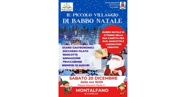 C'è un tempo dell'anno in cui le luci scaldano il cuore e il sorriso dei bambini diventa il regalo più grande. È con questo spirito che sabato 20 dicembre, a partire dalle ore 16.00, Piazza Giovanni Paolo II a Montalfano si trasformerà in un luogo incantato con "Il Piccolo Villaggio di Babbo Natale", iniziativa promossa dall'Associazione Montalfano Terra Nostra.