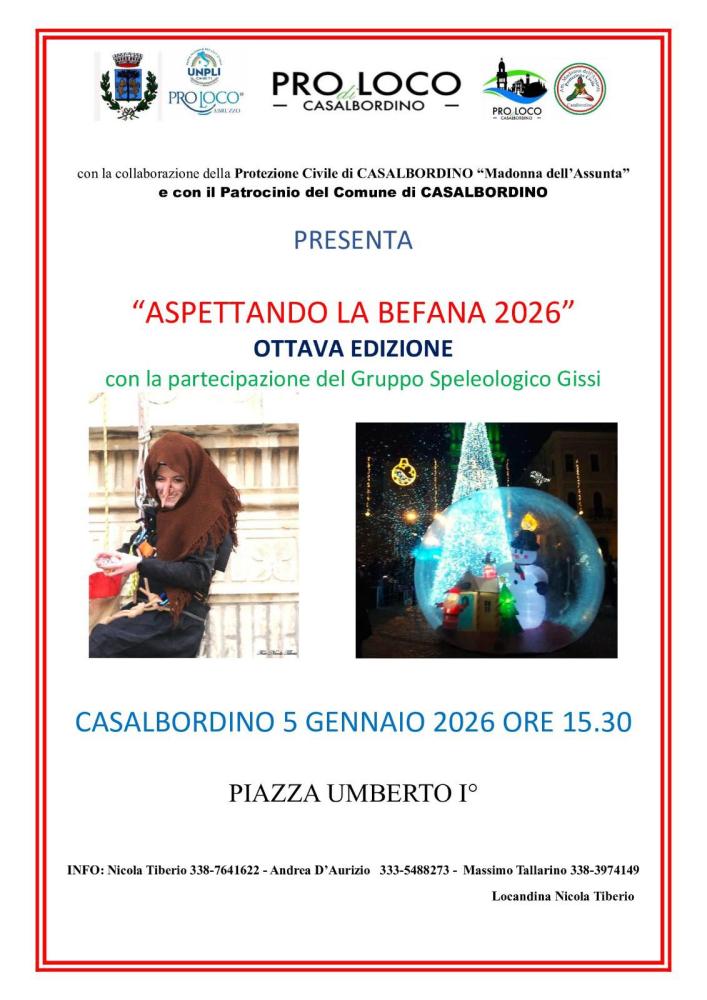 La Pro Loco, in collaborazione con la Protezione Civile "Madonna dell'Assunta" e con il patrocinio del Comune di Casalbordino, organizza l'ottava edizione di “Aspettando la Befana".