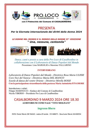 “Le donne nel mondo e il mondo delle donne – II edizione – Una, nessuna, centomila” è il titolo dell’evento in cui verranno proposti danze, canti e poesie dal mondo. Presentatori d’eccezione Lina Margilio e Massimo Tallarino. Interverranno la direttrice del Laboratorio di Danze Popolari dal Mondo Rosa Maria Ulisse, la direttrice del Coro Voci del Vastese Maria Del Bianco e la direttrice della Scuola di danza del ventre Oriente Mirella Rossi, partecipazione straordinaria della poetessa Maria Antonietta Finamore. Introduzione e saluti del sindaco di Casalbordino Filippo Marinucci e del Presidente della Pro Loco di Casalbordino Nicola Tiberio.