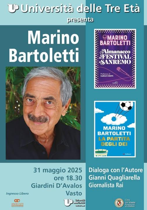 Sabato 31 maggio alle ore 18.30, all’interno dei Giardini di Palazzo d’Avalos, l’Università delle Tre Età di Vasto organizza l’incontro con il giornalista e autore Marino Bartoletti.