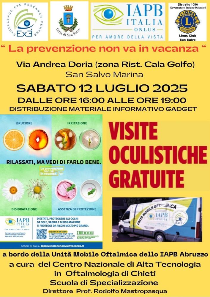 Torna nella regione Abruzzo la campagna “La prevenzione non va in vacanza”, promossa e finanziata dalla Fondazione Sezione Italiana dell'Agenzia Internazionale per la Prevenzione della Cecità - IAPB Italia ETS (www.iapb.it), organizzata dalla Sezione Territoriale di Chieti e dal Consiglio Regionale d’Abruzzo dell’Unione Italiana dei Ciechi e degli Ipovedenti ETS-APS, in collaborazione con il Centro Nazionale di Alta Tecnologia in Oftalmologia della ASL di Chieti, con la Scuola di Formazione in Oftalmologia dell’Università “Gabriele d’Annunzio” di Chieti-Pescara, diretta dal Professor Rodolfo Mastropasqua, e con i Lions Club locali, da sempre in prima linea nella lotta alla cecità.