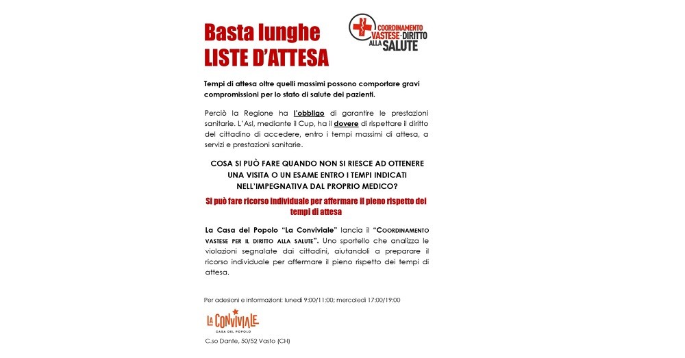 Qualche giorno fa avevamo annunciato la nascita del Coordinamento vastese per il diritto alla salute nato nella Casa del Popolo La Conviviale di Vasto. Ebbene, a pochi giorni dall'avvio dello sportello di assistenza sanitaria per il rispetto delle tempistiche massime per l'accesso alle prestazioni mediche stabilite dalle ricette del medico di base, è stato già ottenuto il riconoscimento di un diritto fondamentale inizialmente negato ad un paziente.