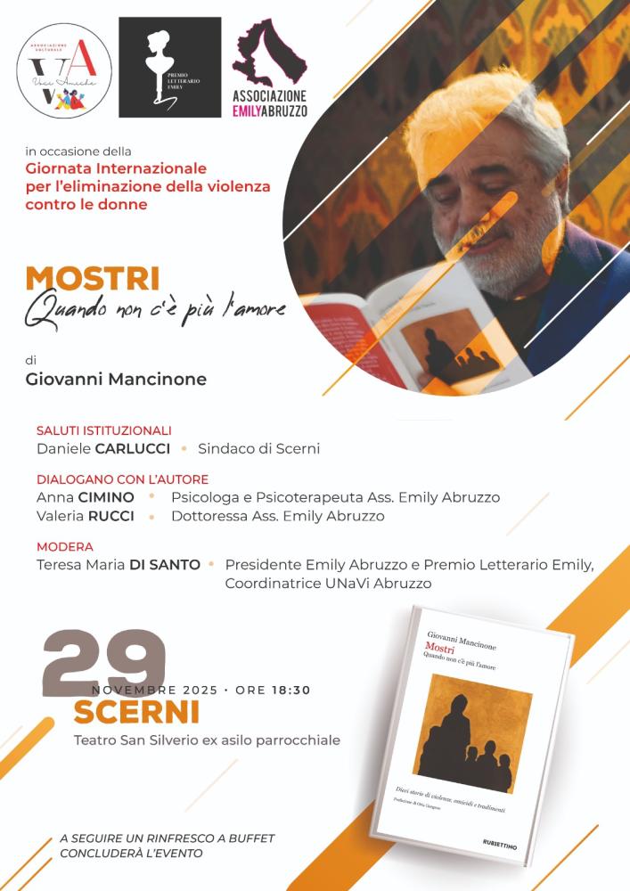 La cultura che si erge contro la violenza sarà protagonista anche di un altro incontro targato Emily Abruzzo, in collaborazione con l'Associazione culturale scernese Voci amiche: quello che avrà luogo sabato 29 novembre presso il Teatro San Silverio (ex Asilo parrocchiale) a Scerni. Qui si terrà la presentazione del libro Mostri. Quando non c'è più l’amore del giornalista e scrittore Giovanni Mancinone, terzo classificato della seconda edizione del Premio Letterario Emily. A dialogare con l'autore Teresa Di Santo e due volontarie dell'Associazione Emily, la psicologa e psicoterapeuta Anna Cimino e la dottoressa Valeria Rucci.