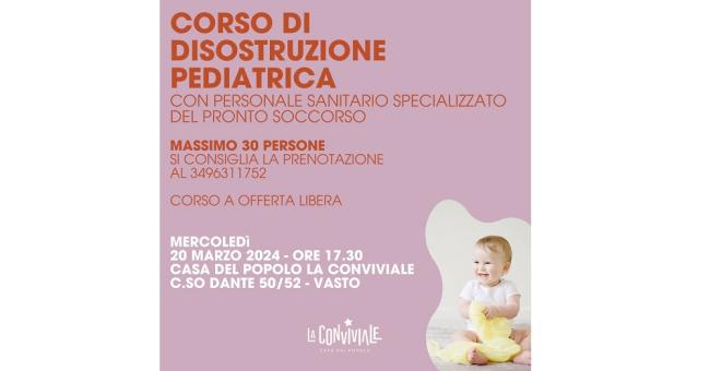 Mercoledì 20 marzo, alle 17.30, presso la Casa del Popolo La Conviviale in Corso Dante 50/52 a Vasto, si terrà il corso di disostruzione pediatrica tenuto dal personale sanitario specializzato del Pronto Soccorso.
