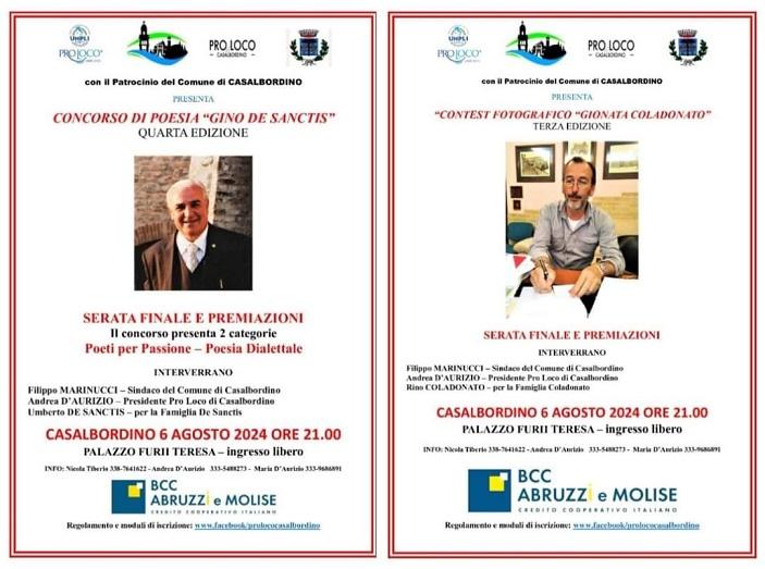 Martedì 6 agosto alle ore 21, nella suggestiva cornice di largo Palazzo Furii, la Pro Loco di Casalbordino organizza la serata finale di premiazione dei concorsi di poesia e fotografia indetti in memoria di Gino De Sanctis e Gionata Coladonato. Durante la serata le giurie proclameranno i vincitori nelle varie categorie e verranno ricordati due indimenticabili casalesi. Il tema di quest’anno è l’acqua, per chi volesse partecipare può inviare l’opera e il modulo di iscrizione alla email prolocodicasalbordino@gmail.com . I moduli di iscrizione e i regolamenti sono disponibili sulla pagina “PRO LOCO di Casalbordino” all’indirizzo https://www.facebook.com/profile.php?id=100090917247695 .