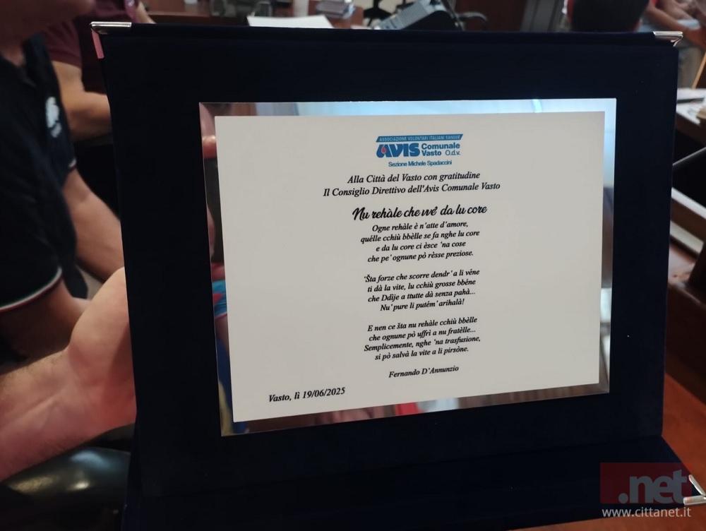 «Esprimiamo – dichiarano il sindaco Francesco Menna e l’assessore al Sociale Anna Bosco - le nostre congratulazioni ai membri del nuovo direttivo dell’Avis di Vasto, presentati oggi nell’Aula consiliare del Comune. La loro disponibilità e il loro impegno rappresentano un valore prezioso per l’intera comunità . L’Avis ricopre un ruolo fondamentale nel nostro territorio, promuovendo la cultura del dono e della solidarietà attraverso la raccolta di sangue, gesto semplice ma essenziale per salvare vite umane. L’attività quotidiana dell’associazione è insostituibile e preziosa. Auguri di buon lavoro».