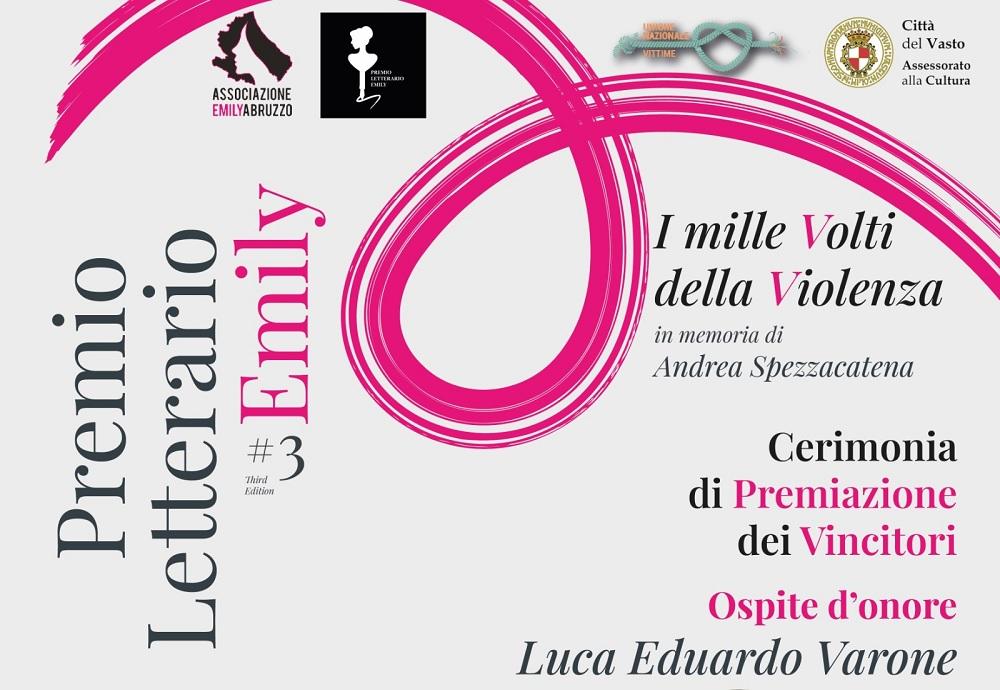 Sabato 6 settembre, a partire dalle ore 21:00, ai Giardini di Palazzo d'Avalos a Vasto si terrà la cerimonia finale della terza edizione del Premio Letterario Emily “I mille volti della violenza”, concorso bandito dall’Associazione Emily Abruzzo con il patrocinio del Comune di Vasto e dell'Unione Nazionale Vittime (UNaVi).