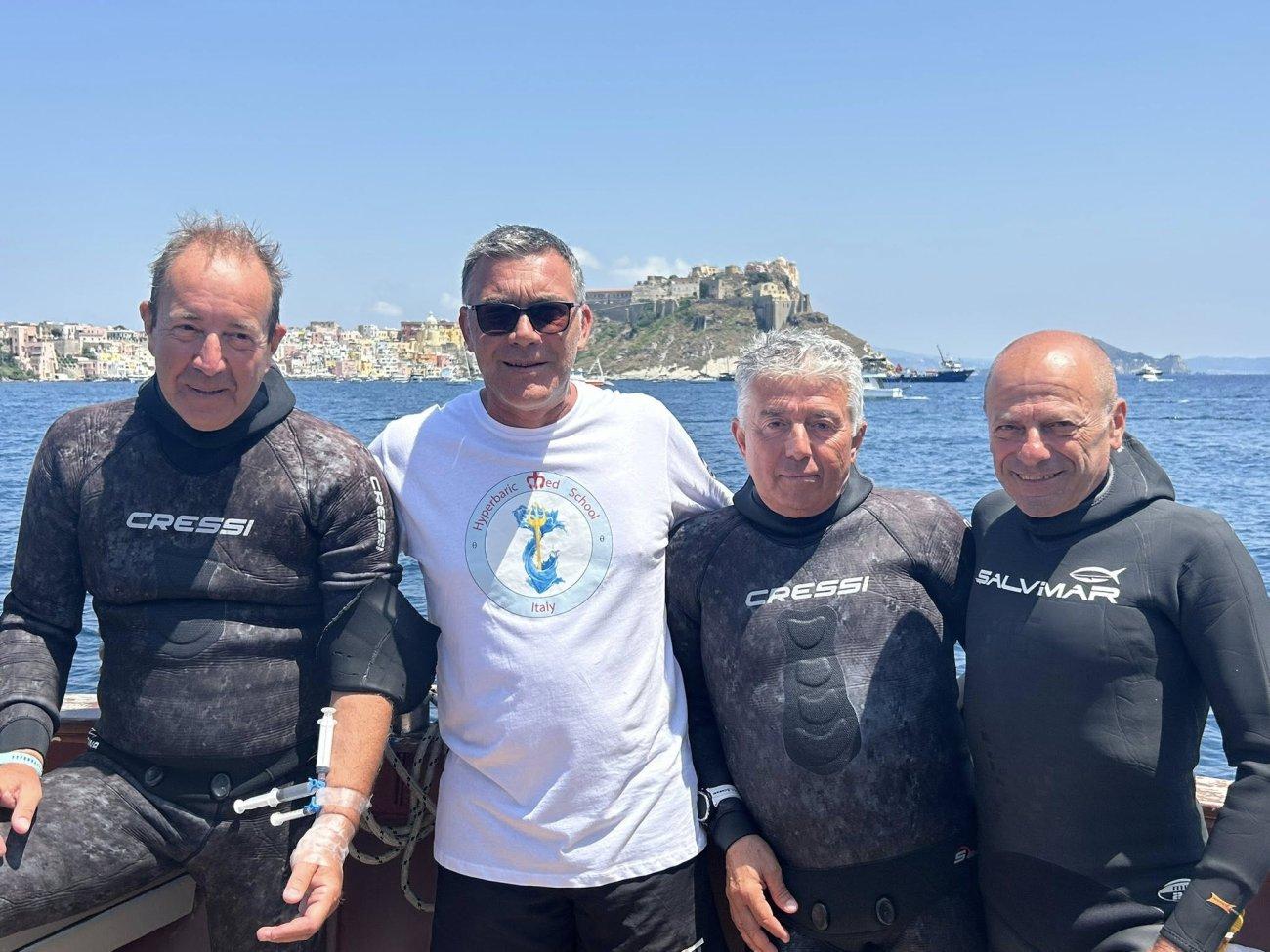 Sono stati effettuati per la prima volta prelievi emogas arteriosi in profondità con ecografia polmonare in mare aperto su un campione numeroso di volontari subacquei e apneisti. Lo scopo è stato di confrontare tra chi respira e chi trattiene il respiro il ruolo della pressione a 15 metri e a 40, sullo scambio gassoso e sulla funzionalità polmonare. Quando un subacqueo si immerge, il corpo subisce cambiamenti importanti dovuti alla pressione dell’acqua.