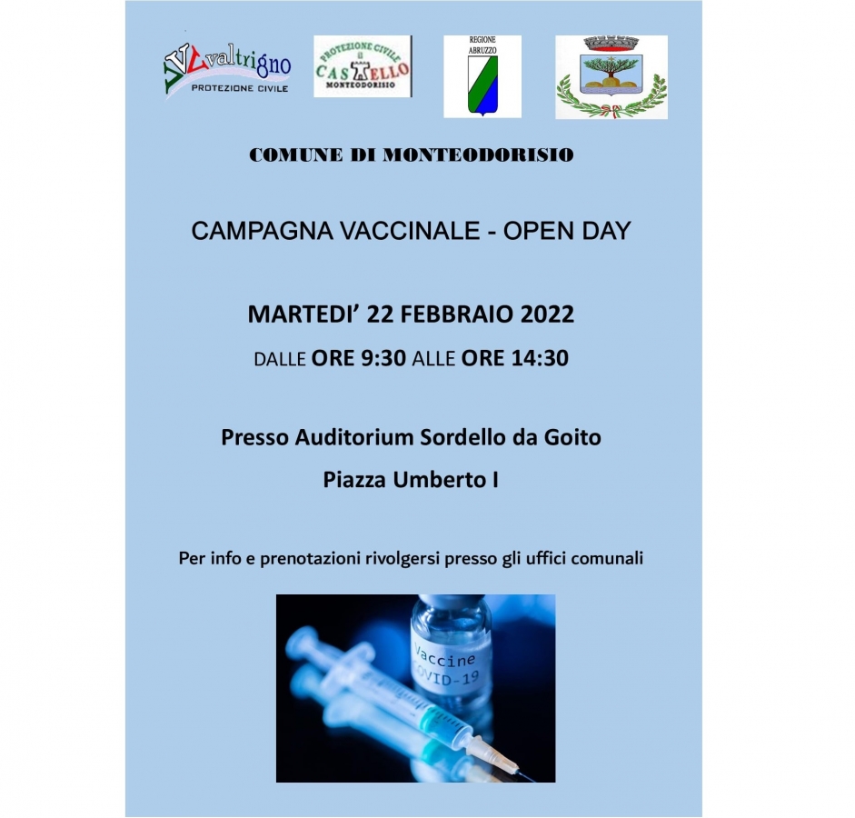 Continua la Campagna Vaccinale al Comune di Monteodorisio che informa che Martedì 22 Febbraio 2022 sarà possibile effettuare il vaccino anti Covid - 19 presso l’Auditorium Sordello da Goito in Piazza Umberto I, dalle ore 09:30 alle ore 14:30.