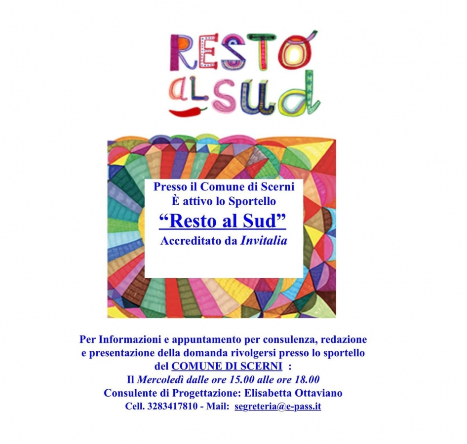 Vuoi essere imprenditore di te stesso? Presso il Comune di Scerni è attivo lo Sportello “Resto al Sud” accreditato da Invitalia. E rivolto a tutti coloro che vogliono metterei in gioco e realizzare il proprio progetto lavorativo. Il Comune sostiene nella consulenza e nella realizzazione del progetto.