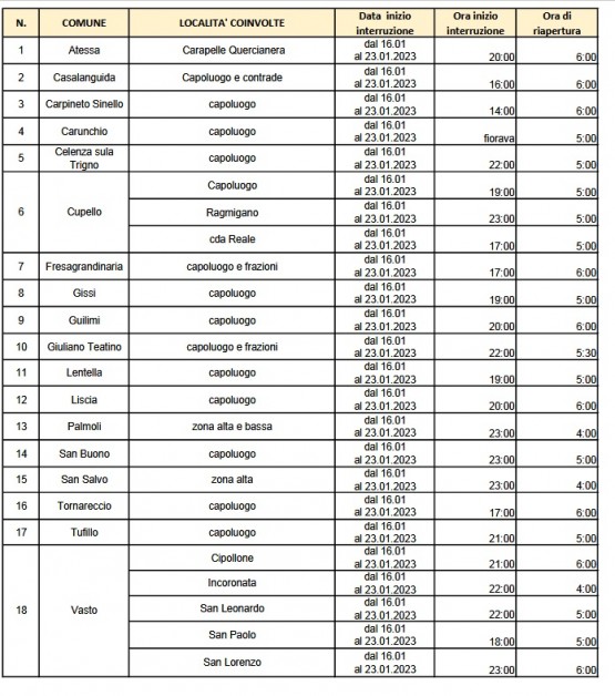 Pubblicato crono programma fino a lunedì prossimo, in queste ore sospensione per sostituzione condotta a Guardiagrele