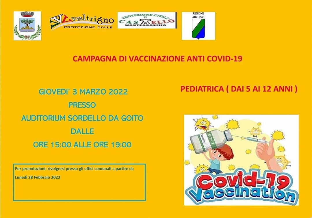 Giovedì 3 marzo 2022, presso l'Auditorium Sordello da Goito di Monteodorisio, dalle ore 15 alle ore 19 sarà possibile ricevere la vaccinazione per tutti i bambini in età pediatrica (dai 5 ai 12 anni).