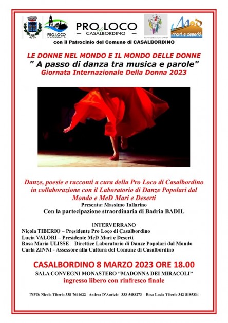 “A passo di danza tra musica e parole”, questo il titolo dell’evento, sarà animato da Danze, poesie e racconti. Presentatore della serata sarà Massimo Tallarino. Partecipazione straordinaria di Badria Nabil e gli interventi di Nicola Tiberio (Presidente della Pro Loco), Lucia Valori (Presidente dell’associazione MeD-Mari e Deserti), Rosa Maria Ulisse (Direttrice del Laboratorio di Danze Popolari dal Mondo) e Carla Zinni (vicesindaca e assessore alla cultura del Comune di Casalbordino).