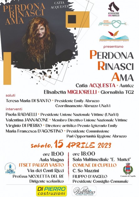 Si terrà sabato 15 aprile, alle ore 11:00 presso l'ITSET F. Palizzi di Vasto e alle ore 18:00 presso la Sala Multimediale “E. Mattei” del Comune di Cupello, la presentazione del volume Perdona, rinasci, ama della scrittrice e giornalista Catia Acquesta, CaEdizioni.