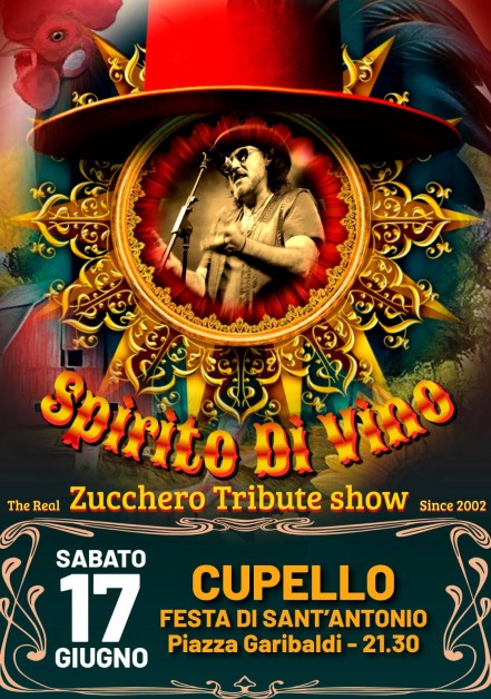 Sabato 17 giugno 2023 a Cupello, presso Piazza Garibaldi ci sarà il gruppo musicale “Spirito Di Vino – The Real Zucchero Tribute show”, previsto in occasione della Festa di Sant’Antonio, che era stato rinviato a causa del maltempo.
