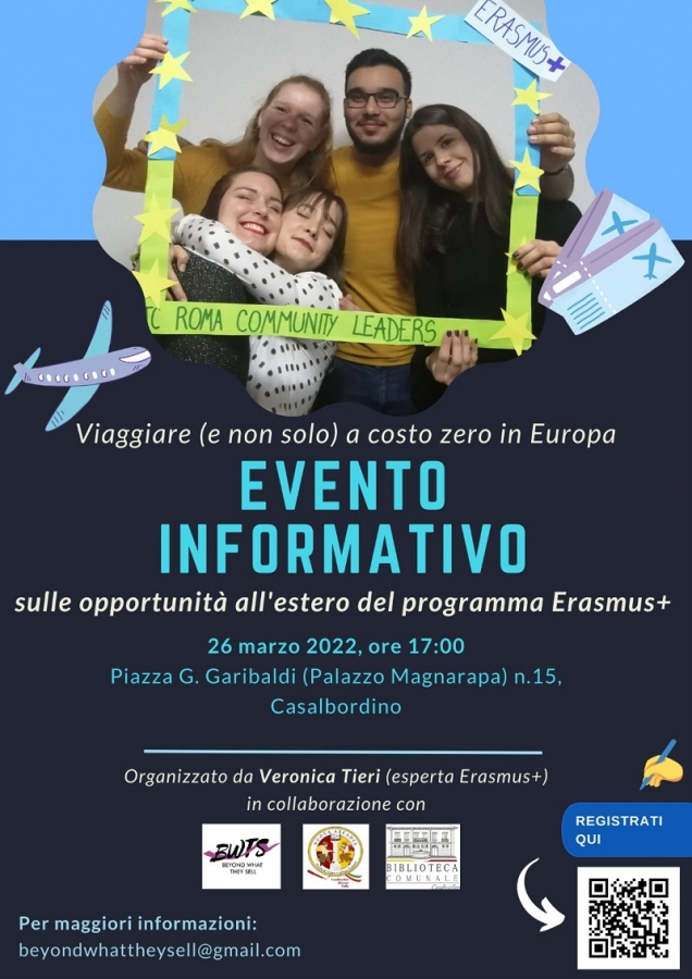 Sabato 26 marzo alle ore 17 presso la Biblioteca Comunale (Palazzo Magnarapa) in piazza Garibaldi a Casalbordino Veronica Tieri, esperta in campo di opportunità all’estero del programma Erasmus+, terrà un incontro informativo in collaborazione con l'associazione di promozione sociale Beyond What They Sell e la Scuola Nuova Arcadia di Casalbordino. “Cos'è l'Erasmus+? Posso partecipare anche se non studio in università? Che cos’è il Corpo Europeo di Solidarietà? Che differenze ci sono tra questi programmi? Cos'è l'educazione non-formale?” queste le domande a cui l’incontro fornirà risposte per far conoscere ed informare sul programma Erasmus+.
