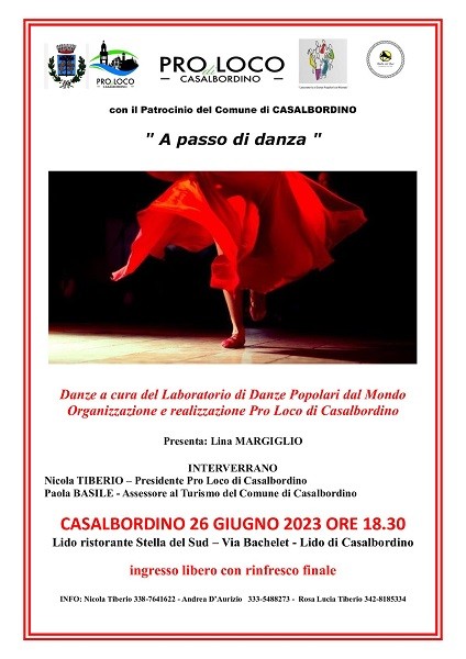 Nuovo appuntamento con “A passo di danza” a Casalbordino. Dopo il grande successo e riscontro dell’evento organizzato in occasione della Giornata Internazionale della Donna la Pro Loco di Casalbordino, unitamente al Laboratorio di Danze Popolari dal Mondo, propone una versione estiva della serata di danza.