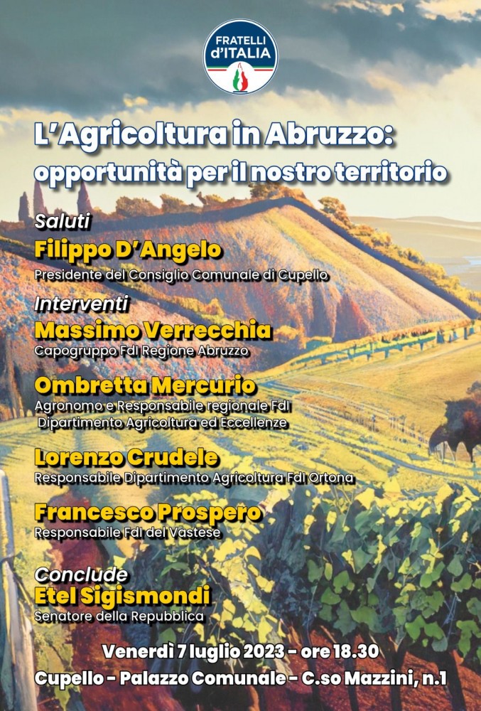 Dopo i saluti del Presidente del Consiglio comunale di Cupello, Filippo D’Angelo, interverranno: Massimo Verrecchia, Capogruppo FDI Regione Abruzzo; Ombretta Mercurio, Agronomo e Responsabile regionale FDI Dipartimento Agricoltura ed Eccellenze; Lorenzo Crudele, Responsabile Dipartimento Agricoltura FDI Ortona e Francesco Prospero, Responsabile FDI del Vastese. Conclude i lavori il Senatore Etel Sigismondi.