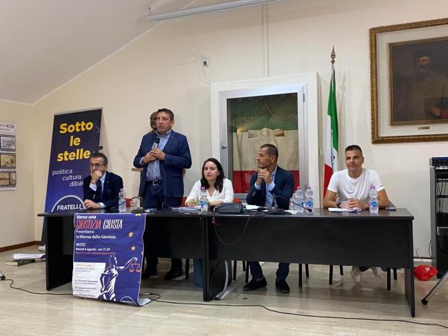 Ad aprire i lavori l’arch. Piernicola Carlesi, Coordinatore di Fratelli d’Italia Vasto, a seguire sono intervenuti: il senatore Etelwardo Sigismondi, Coordinatore di Fratelli d’Italia della Regione Abruzzo; il sen. Costanzo della Porta, componente della 1º commissione Affari Costituzionali; l’avv. Francesco Prospero, Consigliere Comunale di Fratelli d’Italia Vasto e l’avv. Giampaolo Di Marco, Segretario Generale dell’Associazione Nazionale Forense. Ha moderato l’avv. Carla Zinni, Vicesindaco di Casalbordino.