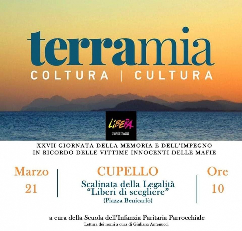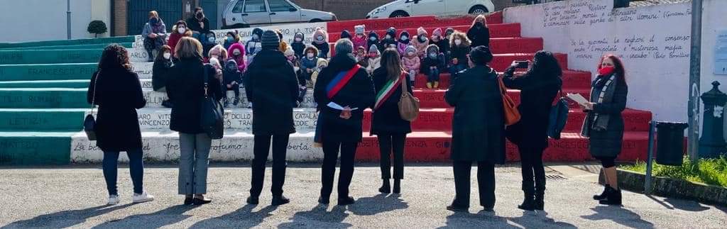 Ieri 21 marzo in onore della Giornata della memoria e dell’impegno in ricordo delle vittime innocenti delle mafie, si è tenuta la manifestazione in Piazza Benincarlò a Cupello, con la partecipazione della Scuola dell’Infanzia Parrocchiale aderente alla rete  di “Libera”. La manifestazione nazionale è stata svolta a Napoli e contemporaneamente in alcune piazze d’Italia, Europa, Africa, America Latina, con l’esercizio di leggere 1050 nomi di vittime innocenti delle mafie presso la Scalinata della Libertà chiamata “Liberi di scegliere”, realizzata stesso dai bambini della scuola nel 2020, in collaborazione con il Comune di Cupello. Non solo si è fatto sì che i bambini partecipassero attivamente al progetto attraverso quest’opera di street art, ma è stato rivalutato anche un luogo sottoposto in passato ad atti vandalici.