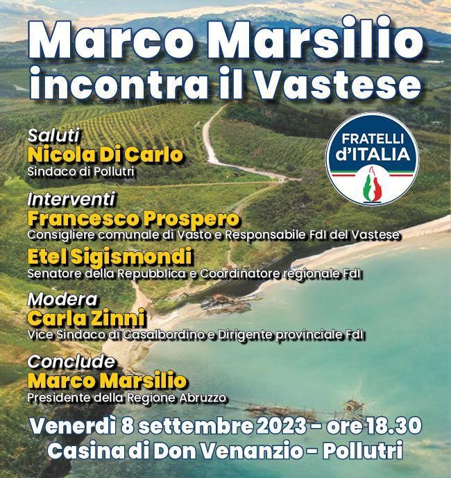 Venerdì 8 settembre 2023, alle ore 18.30, presso la Casina di Don Venanzio a Pollutri, il Presidente della Regione Abruzzo, Marco Marsilio incontrerà il Vastese per parlare del futuro e delle opportunità del nostro territorio.