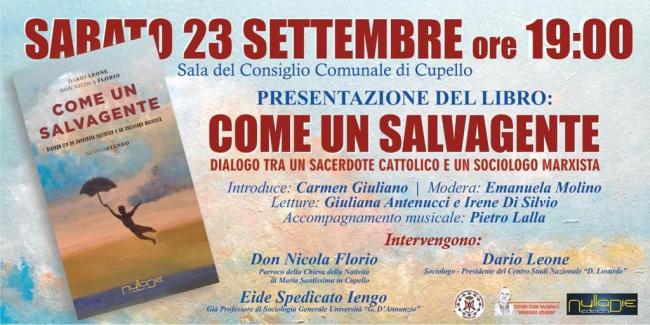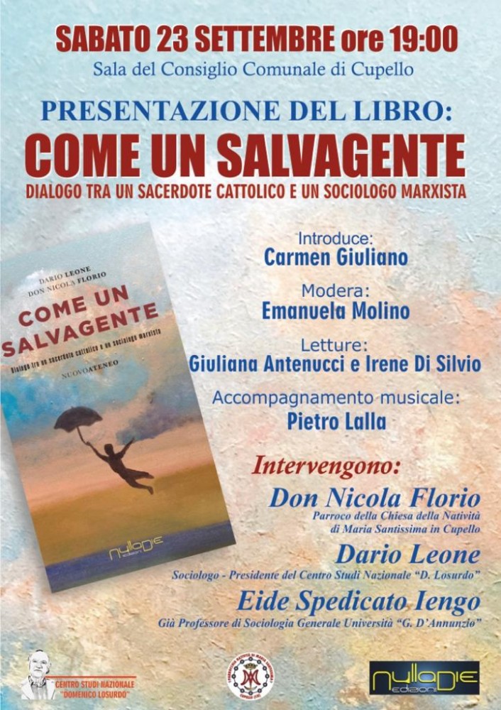 Sabato 23 settembre 2023, presso la Sala del Consiglio Comunale di Cupello, alle ore 19.00, ci sarà la presentazione del libro dal titolo: “Come un salvagente”, edito da Nulla Die. Un dialogo tra un sacerdote cattolico, Parroco della Chiesa della Natività di Maria Santissima di Cupello, Don Nicola Florio e un sociologo marxista, Presidente del Centro Studi Nazionale “D. Losurdo”, Dario Leone.