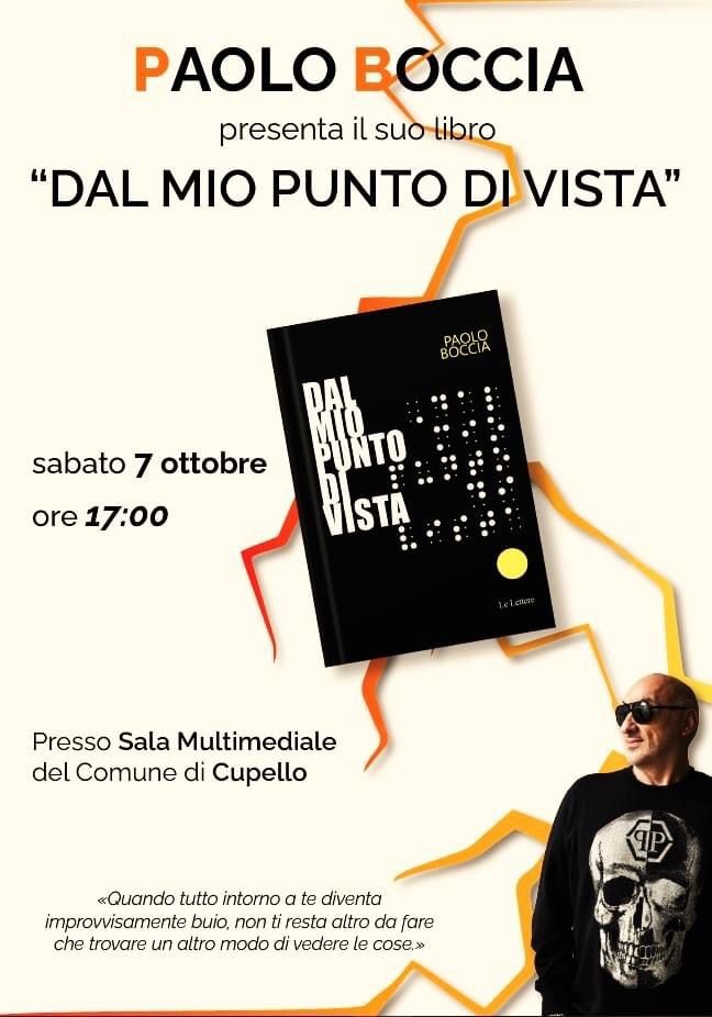 Sabato 7 ottobre 2023, alle ore 17.00, presso la Sala Multimediale del Comune di Cupello, l’autore Paolo Boccia presenta il suo libro “Dal mio punto di vista”, una storia autobiografica di coraggio e rinascita.