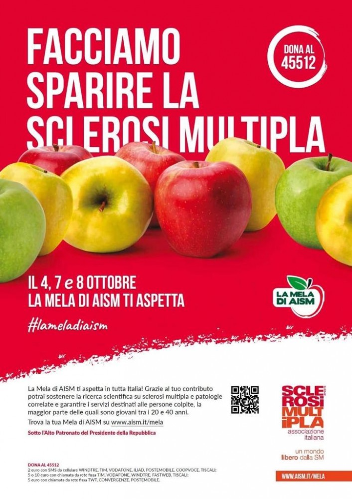 Attraverso un sacchetto di mele (golden, rosse e verdi) potrai donare un contributo e sostenere la ricerca scientifica sulla Sclerosi Multipla e sulle patologie correlate e garantire i servizi destinati alle persone colpite, la maggior parte delle quali sono giovani tra i 20 e i 40 anni.