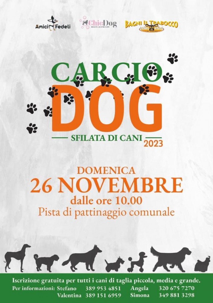 Il CarcioDog, esposizione canina alla sua prima edizione, si farà domenica 26 novembre 2023, alle ore 10.00, presso la Pista di pattinaggio in Via A. De Gasperi.