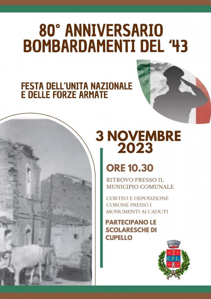 In occasione dell’80esimo anniversario dei bombardamenti del 1943 e della ricorrenza della Festa dell’Unità Nazionale e delle Forze Armate, domani, venerdì 3 novembre 2023, alle ore 10.30, ci sarà il corteo e la deposizione delle corone presso i monumenti dei caduti, con ritrovo e partenza presso il Municipio comunale, a cui parteciperanno le scolaresche di Cupello.
