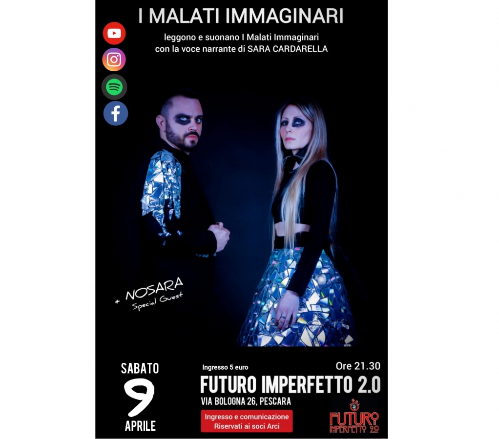 I Malati Immaginari tornano a suonare al Circolo Arci Futuro Imperfetto 2.0 di Pescara. Sabato 9 aprile il duo darkwave vastese presenterà dal vivo quello che sarà il primo disco della band, “Schiena Contro Schiena” di prossima uscita. Per l’occasione, Dario e Laura saranno accompagnati sul palco dalla narratrice e cantastorie Sara Cardarella, che “racconterà” in versi e prosa la storia umana e musicale dei Malati Immaginari. “Non è la prima volta che lavoriamo con lei”, racconta il duo, che prosegue: “Già in passato abbiamo legato la nostra musica alla meravigliosa voce narrante di Sara, anche se al Futuro per la prima volta leggerà dei brani scritti da noi proprio per questo live”.
