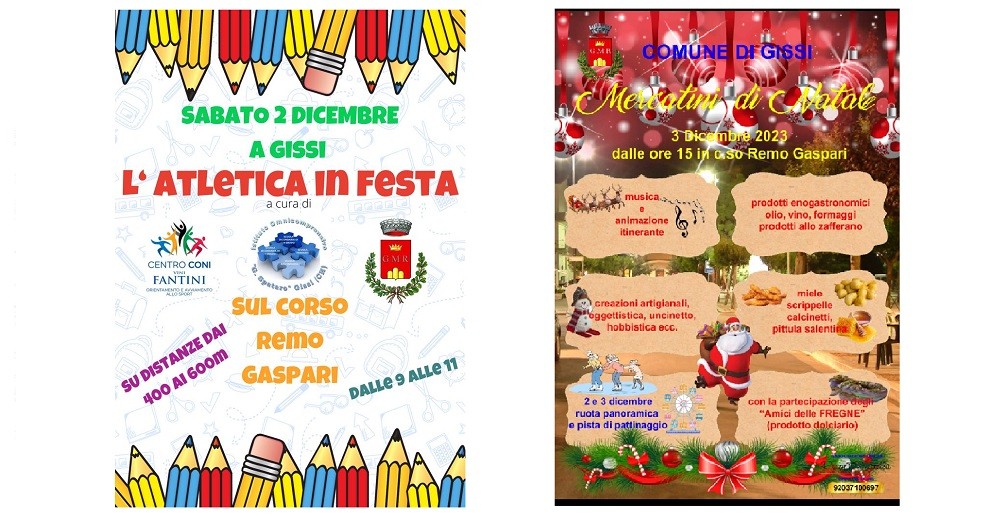 Natale sta arrivando, manca ormai meno di un mese, e i comuni cominciano ad allestire strade e piazze e il calendario degli eventi che animeranno il mese di Dicembre e l’inizio del nuovo anno. Gissi inizierà sabato prossimo, il 2 dicembre, con una giornata dedicata all’atletica e, in particolare, ai ragazzi dai 6 ai 14 anni. Gare ed esibizioni per l’approccio all’atletica e, nel pomeriggio, dalle ore 16 “tanto divertimento con la Mini ruota panoramica e la pista di pattinaggio sul ghiaccio sintetico”. Attrazioni che saranno presenti anche il giorno seguente “in occasione dei mercatini di Natale che a partire dalle ore 15:00 vedrà la presenza di ben 30 espositori tra oggettistica natalizia hobbistica, e prodotti enogastronomici come dolci tipici,le gustosissime fregne, la morbidissima pittula salentina, panini vari prodotti allo zafferano, miele, salumi e tanto altro ancora che esporranno lungo corso Remo Gaspari”. Domenica 3 dicembre alle ore 17 ci sarà anche l’accensione delle luminarie.