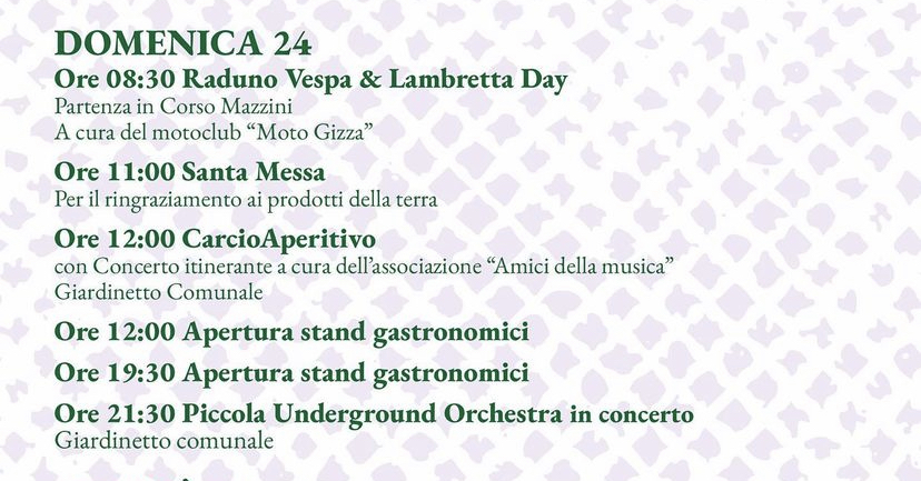 Nella giornata di oggi, si parte in corso Mazzini alle ore 8.30 con il Raduno Vespa & Lambretta Day, organizzato dall’associazione “Moto Gizza”. Alle ore 11.00, invece, nella Chiesa della Natività di Maria Santissima, si terrà la Santa Messa di ringraziamento per i prodotti della terra. Terminata la celebrazione, alle ore 12.00, in concomitanza con l’apertura degli stand gastronomici, si terrà un CarcioAperitivo nel giardinetto comunale, accompagnato da un concerto itinerante a cura dell’associazione “Amici della Musica”.
