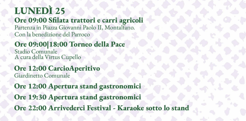 Sì inizia alle ore 9.00 con la Sfilata dei trattori e carri agricoli, con partenza in Piazza Giovanni Paolo II, a Montalfano, e con la benedizione del parroco Don Nicola Florio. Invece, dalle ore 9.00 alle ore 18.00, si terrà , presso lo Stadio comunale, il Torneo della pace, organizzato dall’ASD Virtus Cupello.