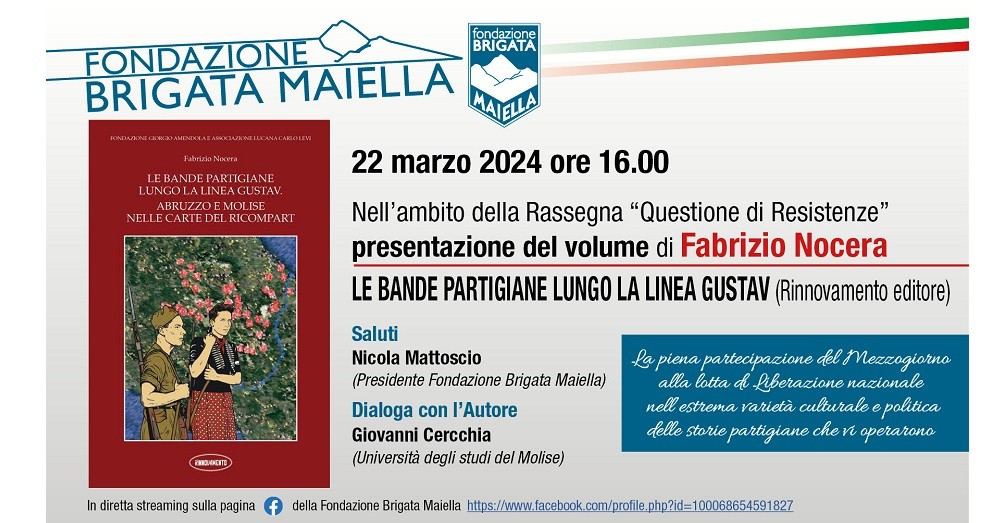 Sarà presentato venerdì 21 marzo dalle ore 16.00, nel corso di un evento organizzato on line dalla Fondazione Brigata Maiella, il volume di Fabrizio Nocera “Le bande partigiane lungo la linea Gustav”.