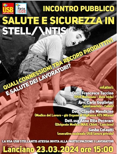 Oggi pomeriggio, presso la Sala convegni "B. Lanci" - Sala di Conversazione a Lanciano (Palazzo comunale) dalle ore 15:00, l'USB organizza un incontro pubblico sul tema della salute e sicurezza in Stellantis.