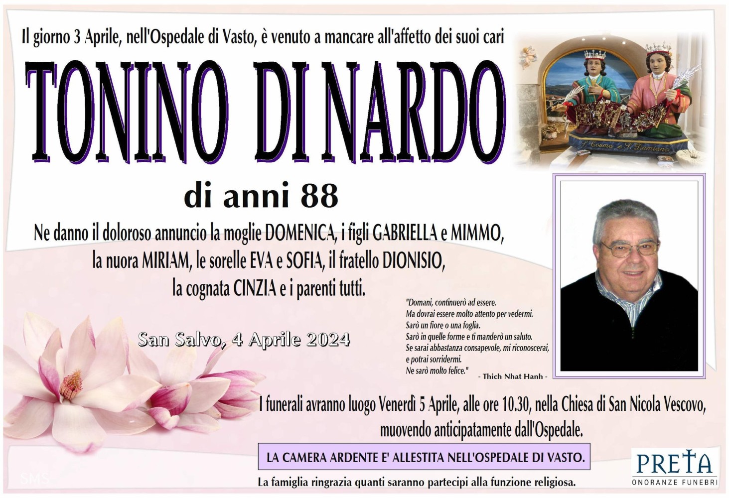 Si è spento all'età di 88 anni all’Ospedale ‘San Pio’ da Pietrelcina' di Vasto, dove era ricoverato da alcuni giorni, Tonino Di Nardo. storico commerciante sansalvese.