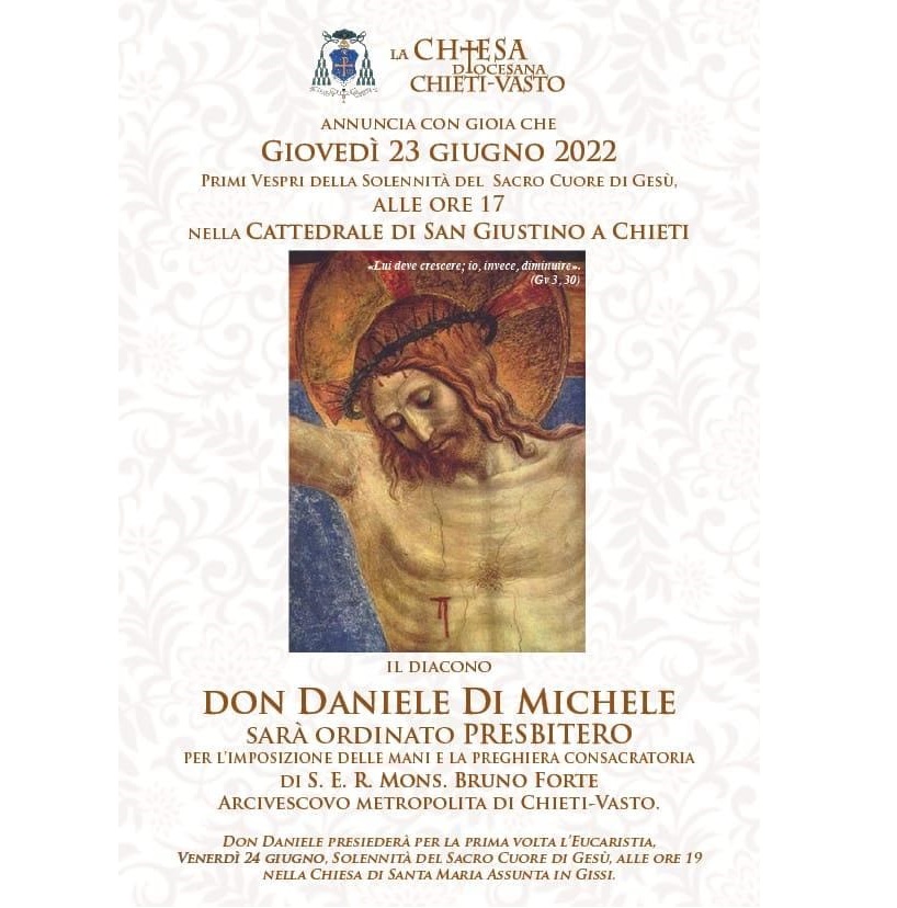 La chiesa Diocesana di Chieti Vasto annuncia con gioia che giovedì 23 giugno 2022 alle ore 17 nella Cattedrale di San Giustino a Chieti il diacono Don Daniele Di Michele sarà ordinato Presbitero da S.E.R. Mons. Bruno Forte, Arcivescovo Metropolita di Chieti-Vasto. "Prego il Signore di potermi rimettere quanto prima in modo da presiedere la liturgia di ordinazione di don Daniele Di Michele, prevista per il giorno 23 giugno alle 17 - scrive monsignor Forte -. Nel caso fossi ancora positivo, ho chiesto a sua Eccellenza Mons. Domenico Scotti di sostituirmi. Offro tutto a Dio per quanti mi sono affidati e a mia volta mi affido alla preghiera di tutti. Vi benedico".