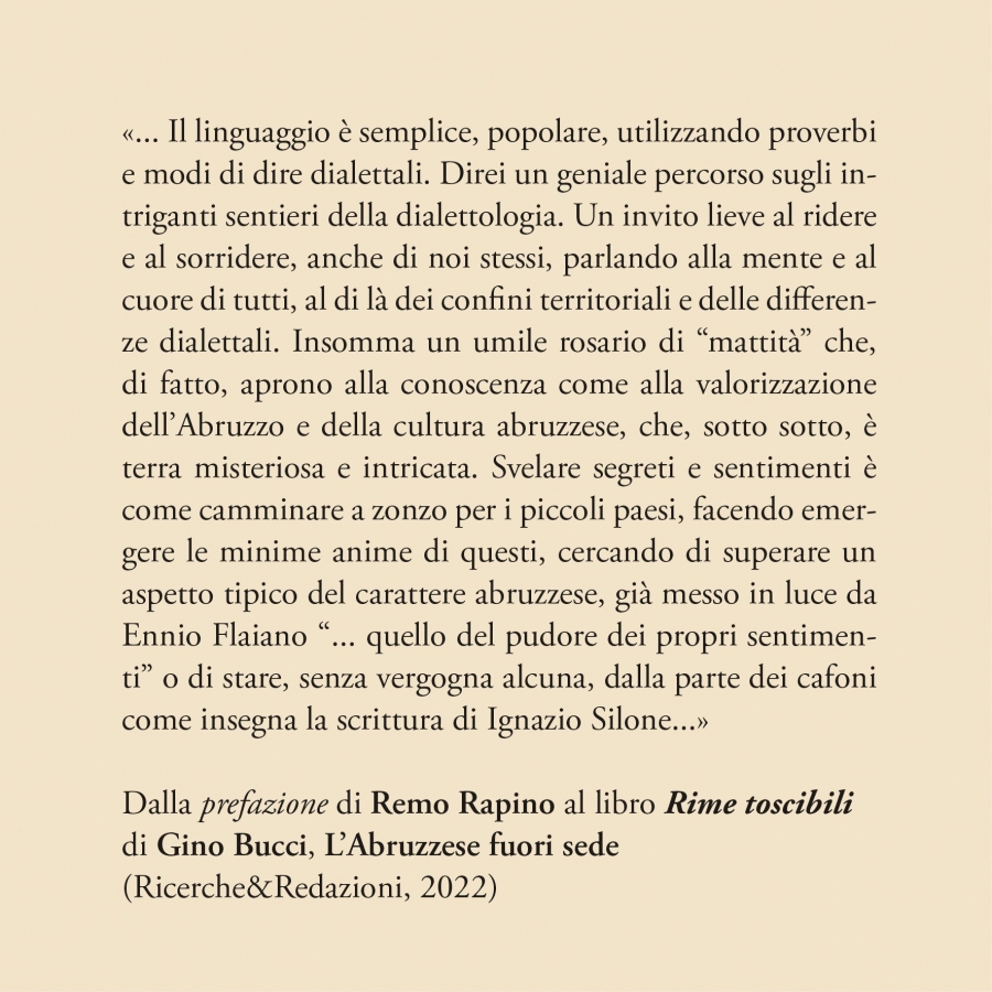 Uscirà il 7 luglio 2022Rime ToscibiliRicerche e Redazioni editore, il libro di Gino Bucci che dirige la pagina su Facebook “L’abruzzese fuori sede”, che con la sua ironia e l’amore per le tradizioni, per la gastronomia, la storia è seguitissimo da tutti gli abruzzesi in tutto il mondo, perché parla dell’Abruzzo a 360 gradi.