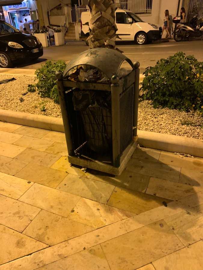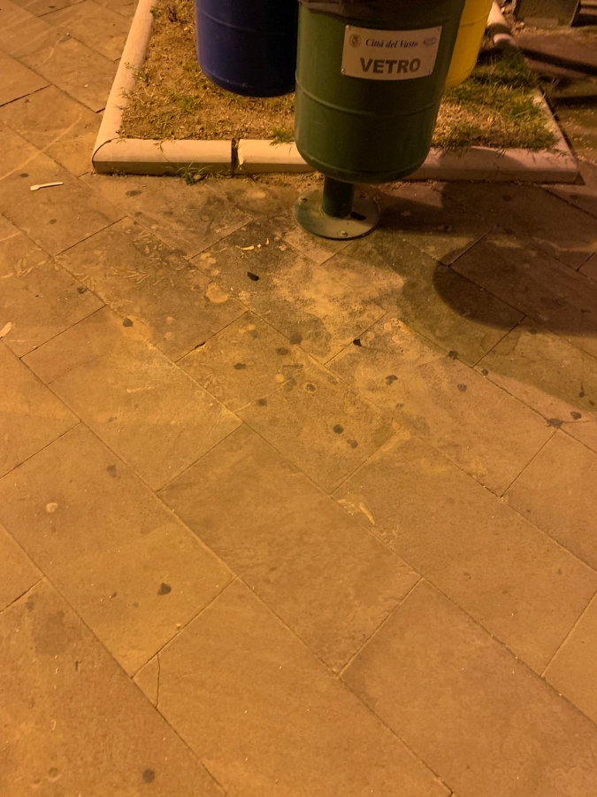 Abbiamo fatto un giro nella zona di Vasto Marina, area di punta durante l’estate, spesso stra popolata da turisti che provengono da tutta Italia e abbiamo trovato alcune cosine poco gradevoli. Si percepisce anche il malcontento da parte degli esercenti del posto su questa situazione che mostra marciapiedi sporchi di sostanze appiccicose mai pulite e lasciate lì per lungo tempo, defezioni canine, cestini dell’immondizia sgangherati, panchine inutilizzabili perché sporche….insomma non proprio un posto lindo e pulito.
