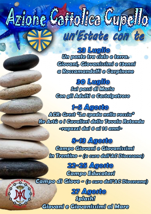 “Noi vogliamo passare un’estate 2022 con te. Tu vuoi restare con noi?”. Con questo motto l’Azione Cattolica di Cupello si prepara a vivere i mesi di luglio e agosto con diversi appuntamenti in cui si alternano preghiera e divertimento, e che, come affermato dal Consiglio AC, abbracciano tutte le fasce di età, dai più piccoli fino al gruppo adulti.